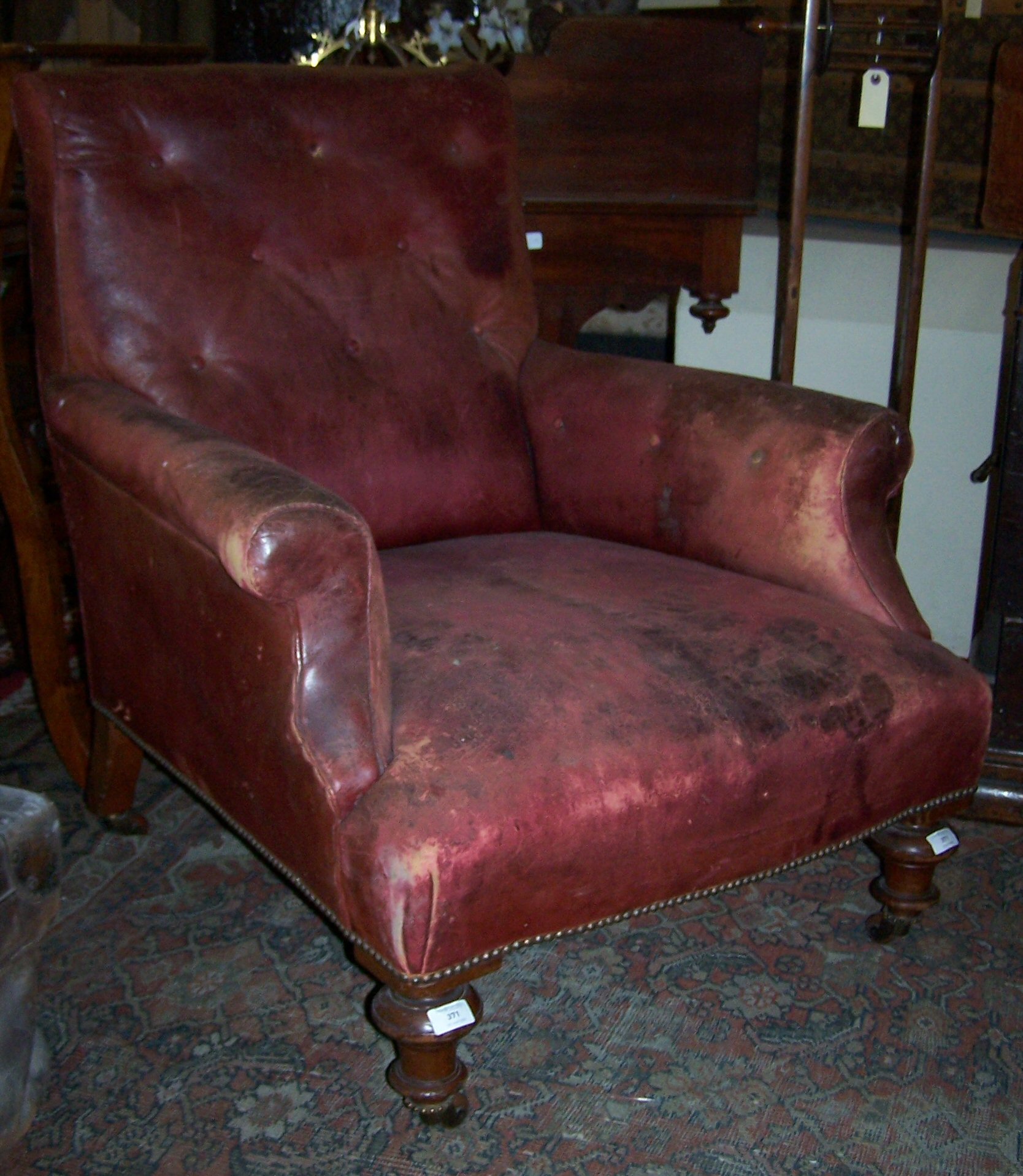 the upholstered button back above rolled arms and stuffover seat in burgundy leather, the whole raised on turned legs with pot castors