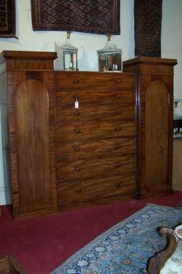 the centre section with bank of seven graduated and cockbeaded drawers, between raised arched panel doors with moulded cornices raised on a plinth base