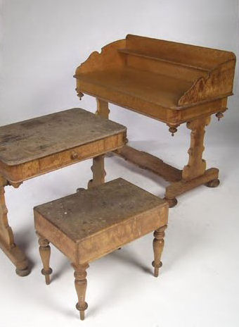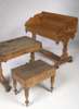 the ledge back with single open shelf flanked by shaped supports on rectangular top, the plain frieze with turned pendants raised on baluster supports with trestle bases by a platform stretcher, 115cm wide, 96cm high, 58cm deep, also a companion side table with single drawer, opposing dummy drawer, 76cm wide and a bidet stool (3)