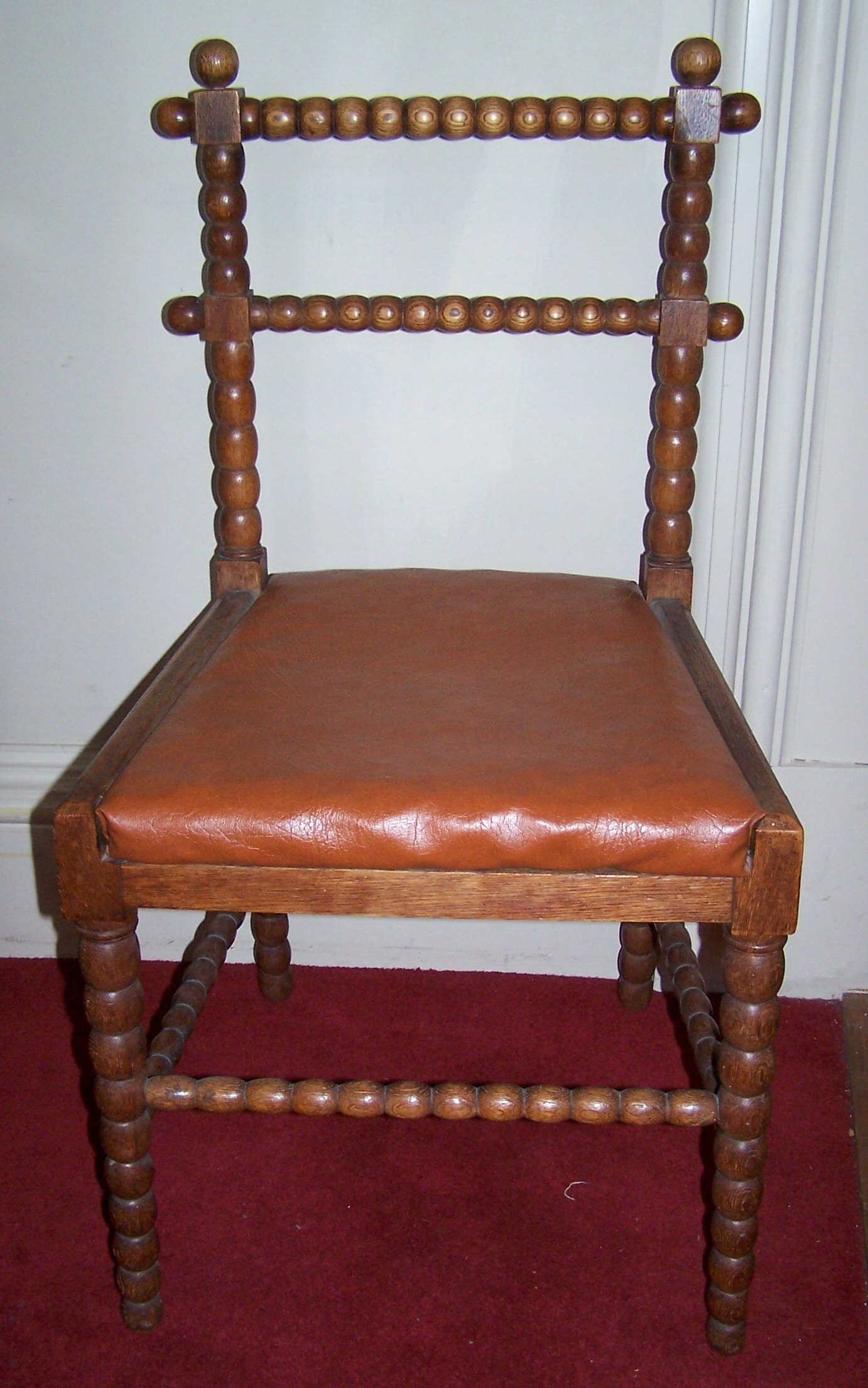 with bobbin-framed back above loose cushion on bobbin turned legs, also a pair of oak framed bobbin turned hand chairs of similar design (3)