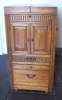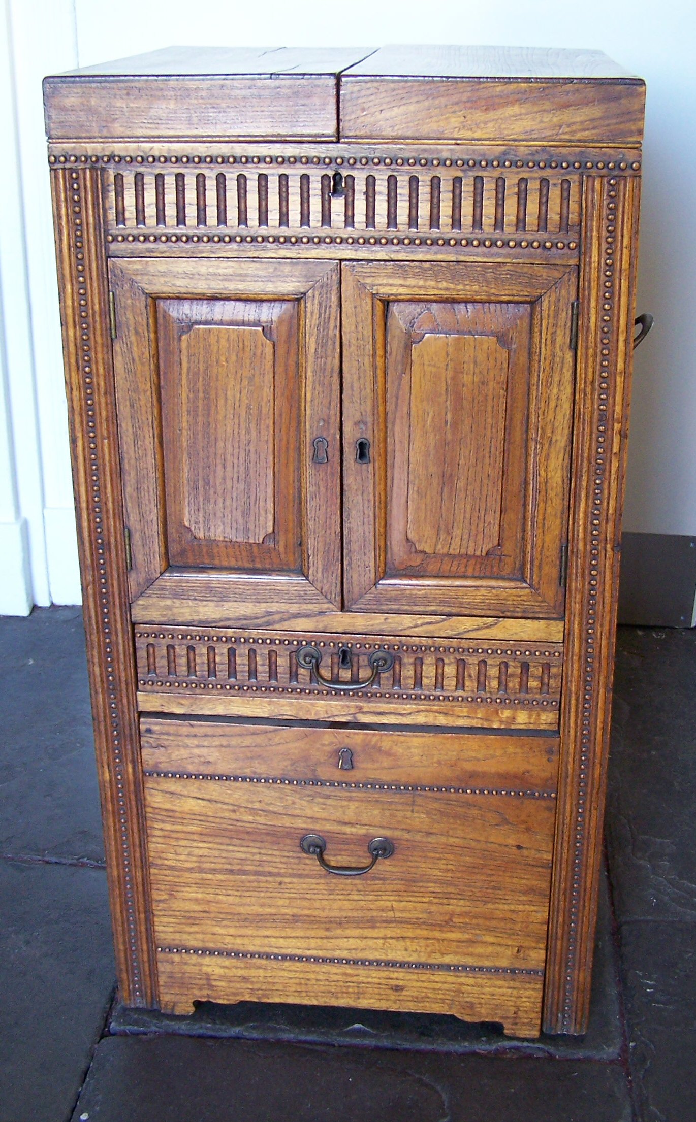 the hinged top enclosing base recessed above a pair of shielded panel cupboard doors, a frieze drawer and a deep base drawers with beaded uprights