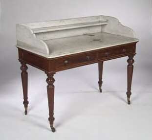 the rectangular top with three quarter gallery and open shelf above two dummy drawers on turned and tapering legs, pot castors
