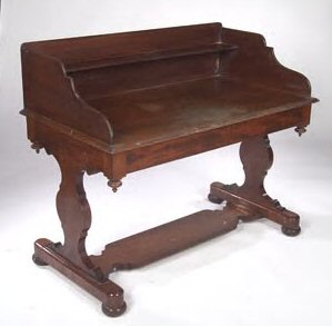 the ledgeback with single open shelf flanked by shaped supports on rectangular top, the plain frieze with turned pendants raised on baluster supports with trestle bases linked by a platform stretcher