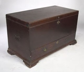 of rectangular form, the hinged lid above plain sides and lower fringe drawer raised on ogee bracket feet (cut)