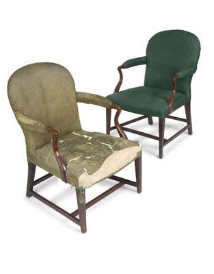 each with arched upholstered backs above open arms with moulded uprights on stuffover seats raised on square tapering legs linked by H-stretchers (one with cut down legs) (2)