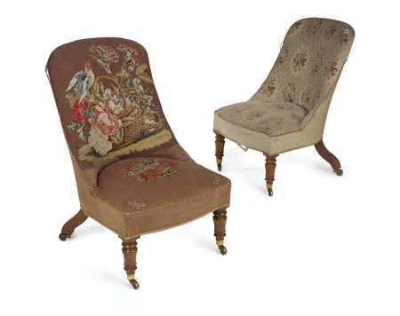 with upholstered spoon back and seat covered in needlework upholstery, raised on turned front legs with sabre legs to the rear and another similar (2)
