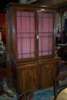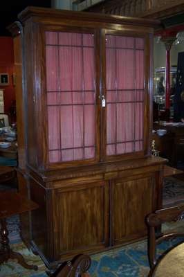 the projecting cornice above two square astragal glazed fabric lined doors, enclosing adjustable slatted shelves, the base with two frieze drawers above two panelled cupboards doors between reeded uprights on bun feet