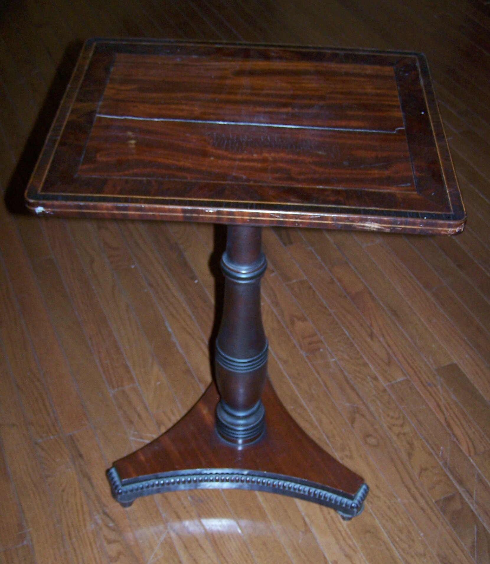 the rectangular top decorated with boxwood stringing partially ebonised and reeded column and concave triform base with beaded line with turned feet