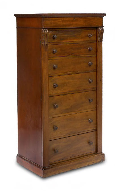 the hinged top enclosing plain compartment above seven graduated drawers with turned handles between hinged locking stiles with leaf carved corbels on plinth base