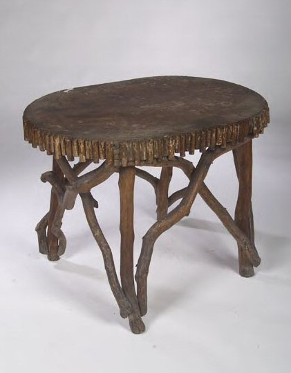 the oval top with applied frieze on rusticated root supports with corresponding stretchers