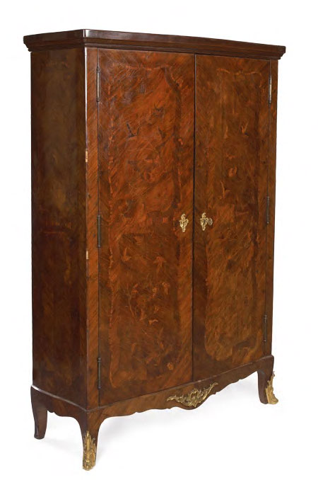 the projecting cornice above twin serpentine doors, each inlaid with flowering branches, the serpentine sides inlaid with parquetry panels, raised on bracket feet with giltmetal sabots
