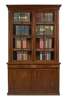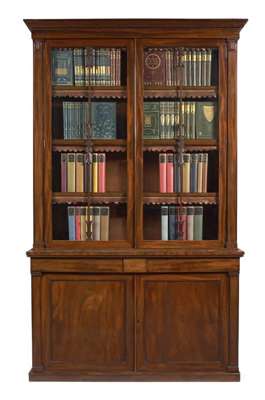 the projecting cornice above two astragal glazed doors carved with leaf and flower motifs and enclosing adjustable shelves fitted with tooled leather dust protectors, the base with two frieze drawers and with panelled doors below, raised on a plinth