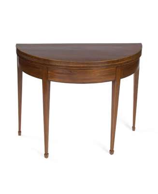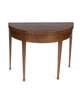with boxwood stringing, the shaped top above a plain frieze on square tapering legs, terminating in pad feet