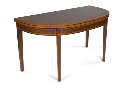 of unusually large size, the D shaped top with satinwood cross banding and with boxwood and ebony stringing above a corresponding frieze, raised on square tapered legs