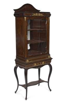 the arched ledge back above an inlaid and leaf carved frieze and single glazed door enclosing shelves, the base with single inlaid drawer raised on cabriole legs linked by a lower tier