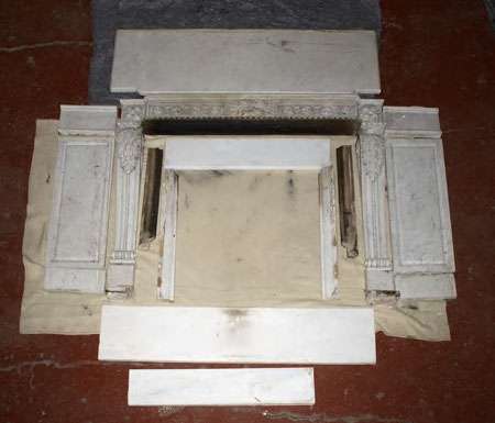 the breakfront mantel above frieze carved with rosette paterae and a ribbon twist border, the jambs decorated with acanthus scroll volutes and centred by ribbon-twists, raised on plinth bases