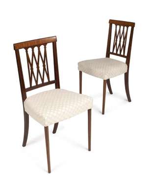 inlaid with boxwood stringing, the satinwood veneered top rails above trellis arched splat backs, the check fabric overstuffed seats on strung circular tapered legs, one chair bears indistinct maker's name to rear leg 'A. Bowler'? (12)