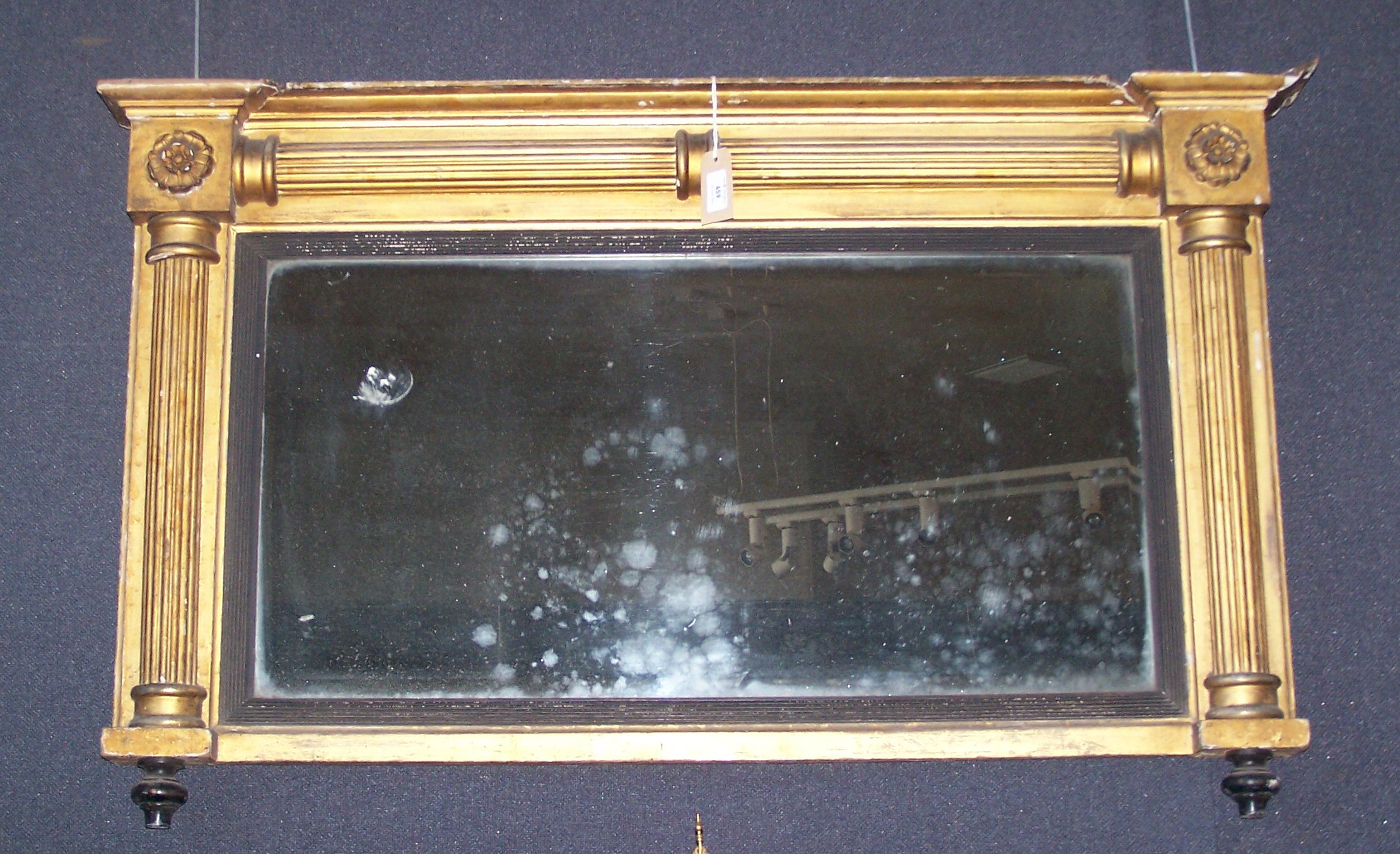 the rectangular bevelled plate within a reeded and ebonised slip, the moulded frame with reeded pilasters and decorated with rosettes to the angles