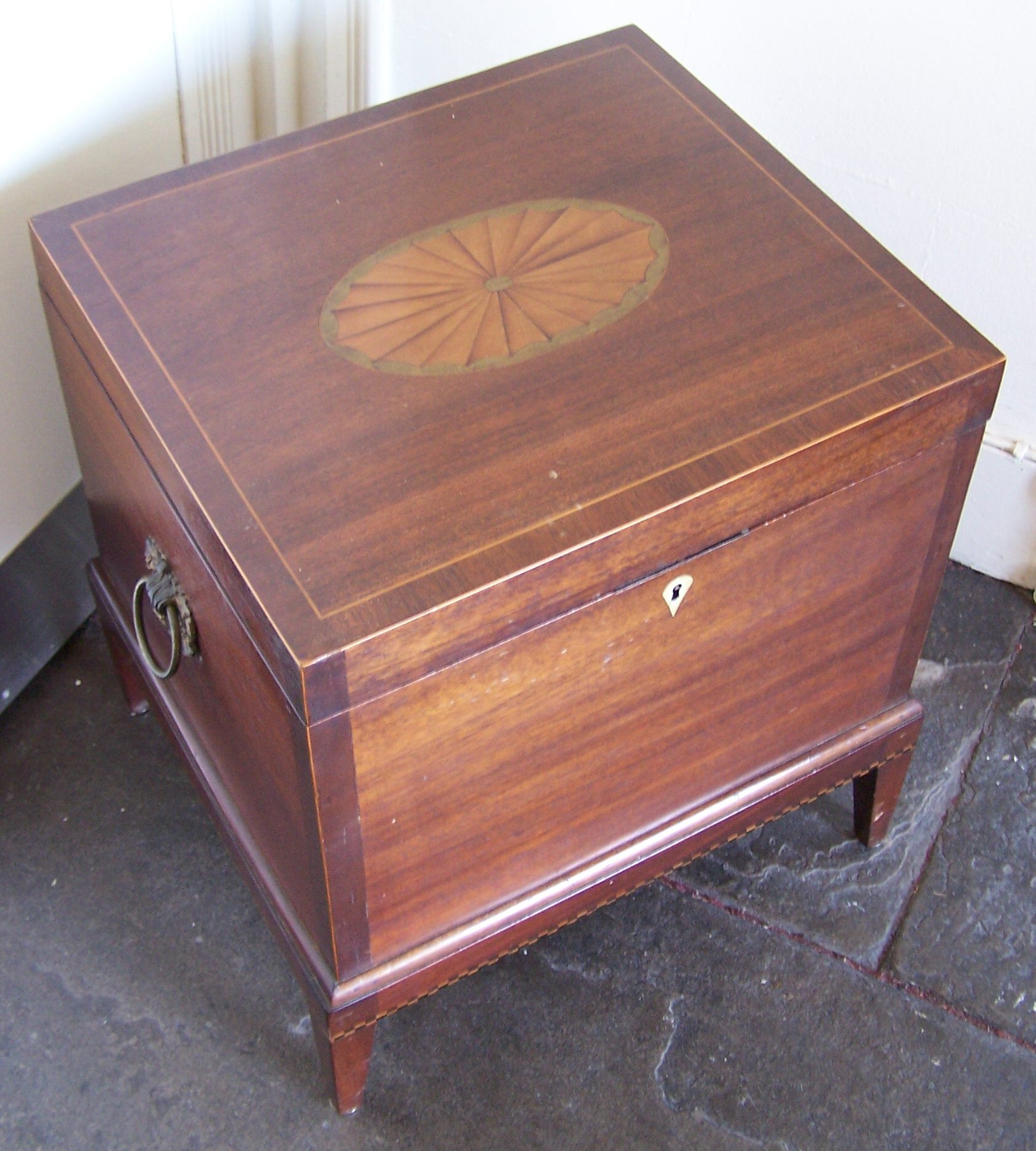 of rectangular form, the hinged lid with fan patera enclosing a fitted interior, the plain sides above a chequer band on square tapering legs