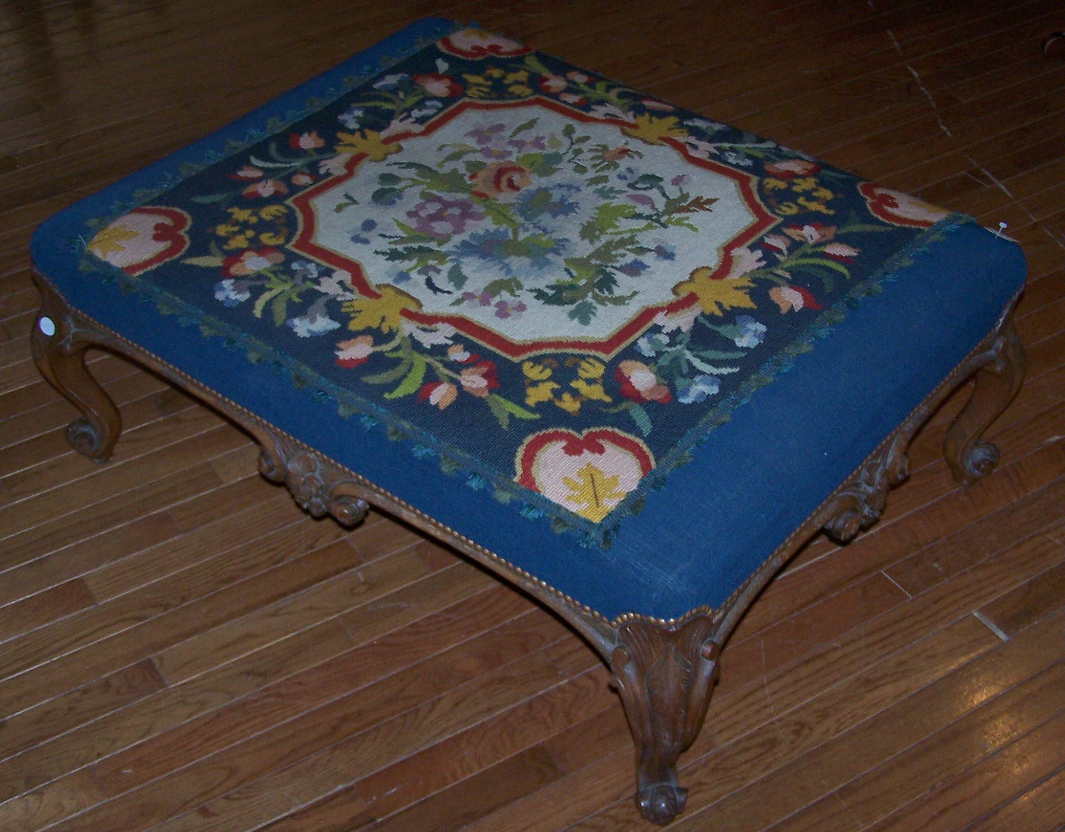 the rectangular upholstered top with applied woolwork panel, above a serpentine carved frieze on bold cabriole legs, carved with flowers