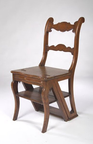 the scrolling and incised top rail and corresponding mid rail above a hinged solid seat, opening to reveal steps and raised on cabriole front legs