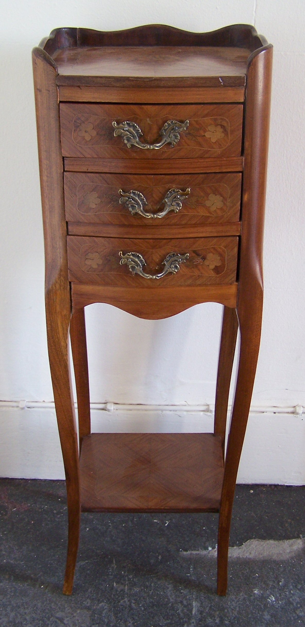 each with shaped rectangular tops, inlaid with floral sprays, above two drawers raised on slender cabriole legs linked by a lower tier (2)