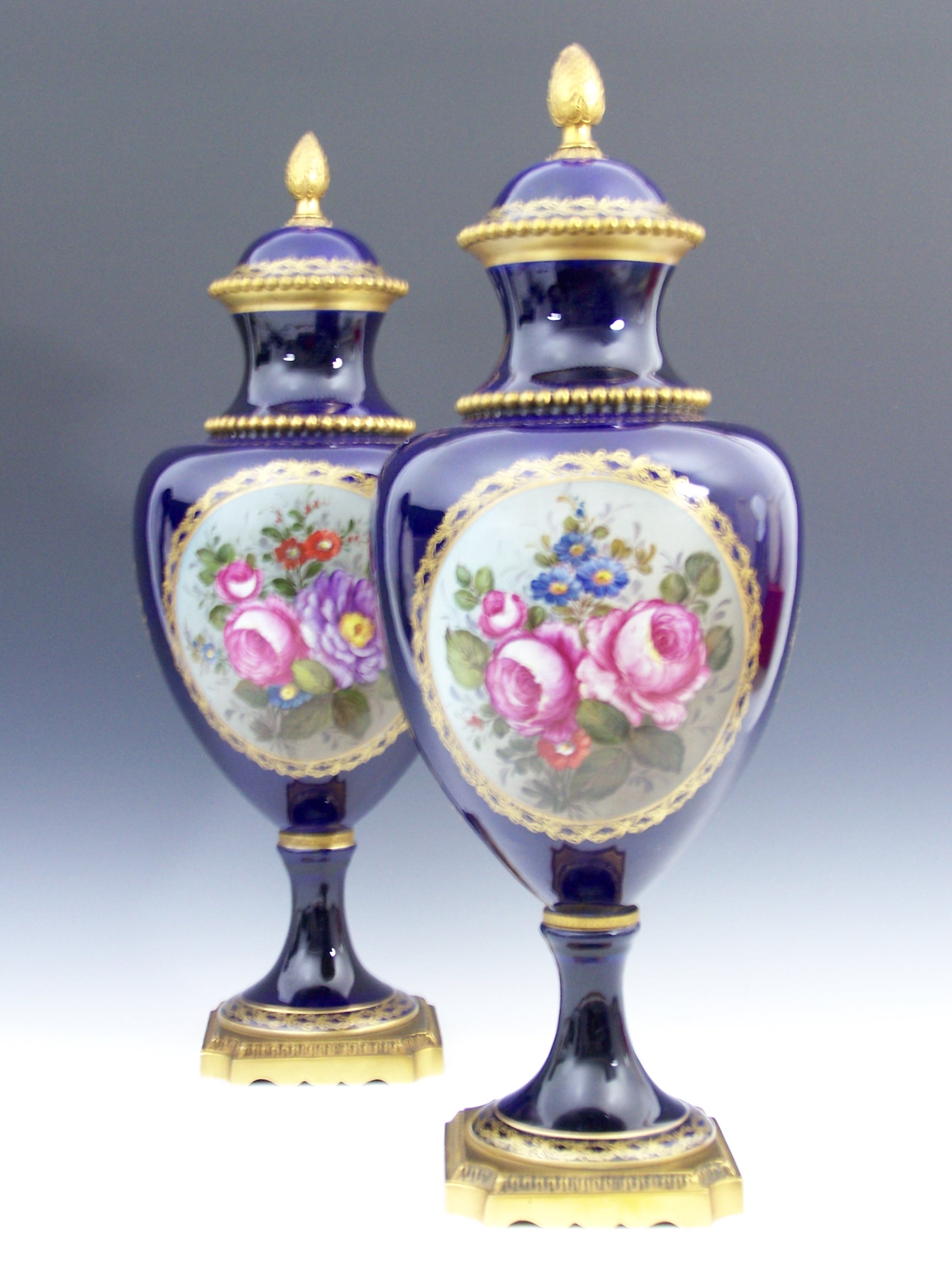 each with giltmetal acorn finial above false cover with gilt scrolling border, the neck with floral and trumpet motif between beaded giltmetal bands, the baluster body with opposed oval panels against a dark blue ground, one depicting figures in a landscape, the other a flower spray, framed by scrolling foliage, on circular foot and canted square giltmetal base (2)