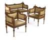 comprising a pair of armchairs and a canape, each with flower carved and moulded top rails enclosed by finials and scrolling infilled arms, raised above upholstered panelled seats on turned and fluted tapering legs (3)