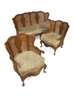 comprising a sofa and two matching armchairs, the leaf-carved serpentine top rail above vase shaped splats and carved panels, the scrolling arms above drop-in seats and carved aprons, the whole raised on cabriole legs (3)