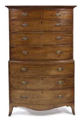 the moulded and projecting cornice above two short and three long graduated drawers, the base with three long graduated drawers, the whole raised on outswept bracket feet