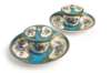 each cup of tapering form, the covers, cups and saucers all decorated with cartouche panels framed in gilt with scrolling foliage and painted with summer flowers and fruit, on bleu celeste ground; together with a small tea cup, similar, blue painted marks (7)