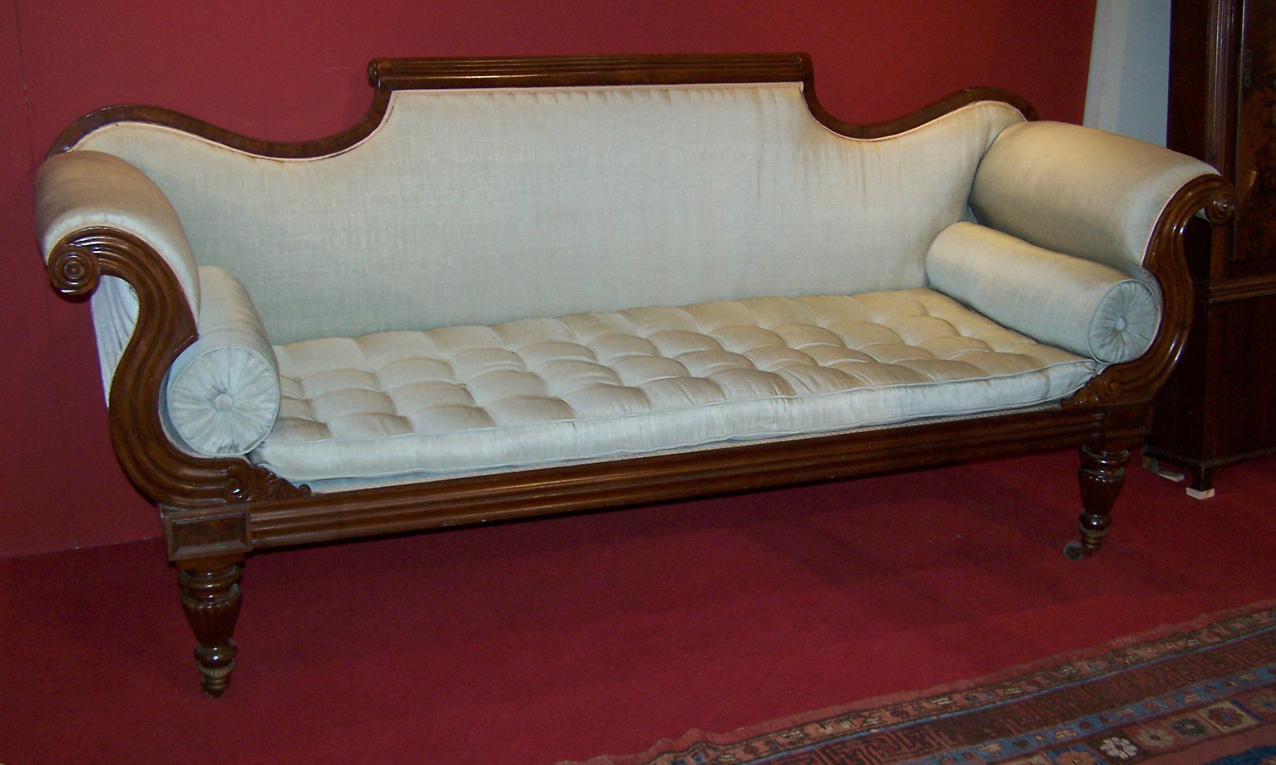 to match the previous lot, with light green silk upholstered and matching roll cushions and buttoned base cushion, the scroll shaped moulded ends, raised on front turned legs with reeled decoration terminating in brass bucket castors