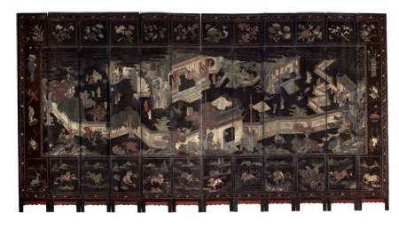 comprising twelve rectangular folds, each carved in bas relief, depicting landscape scenes and enclosing panels of flowers and animals, painted in colours