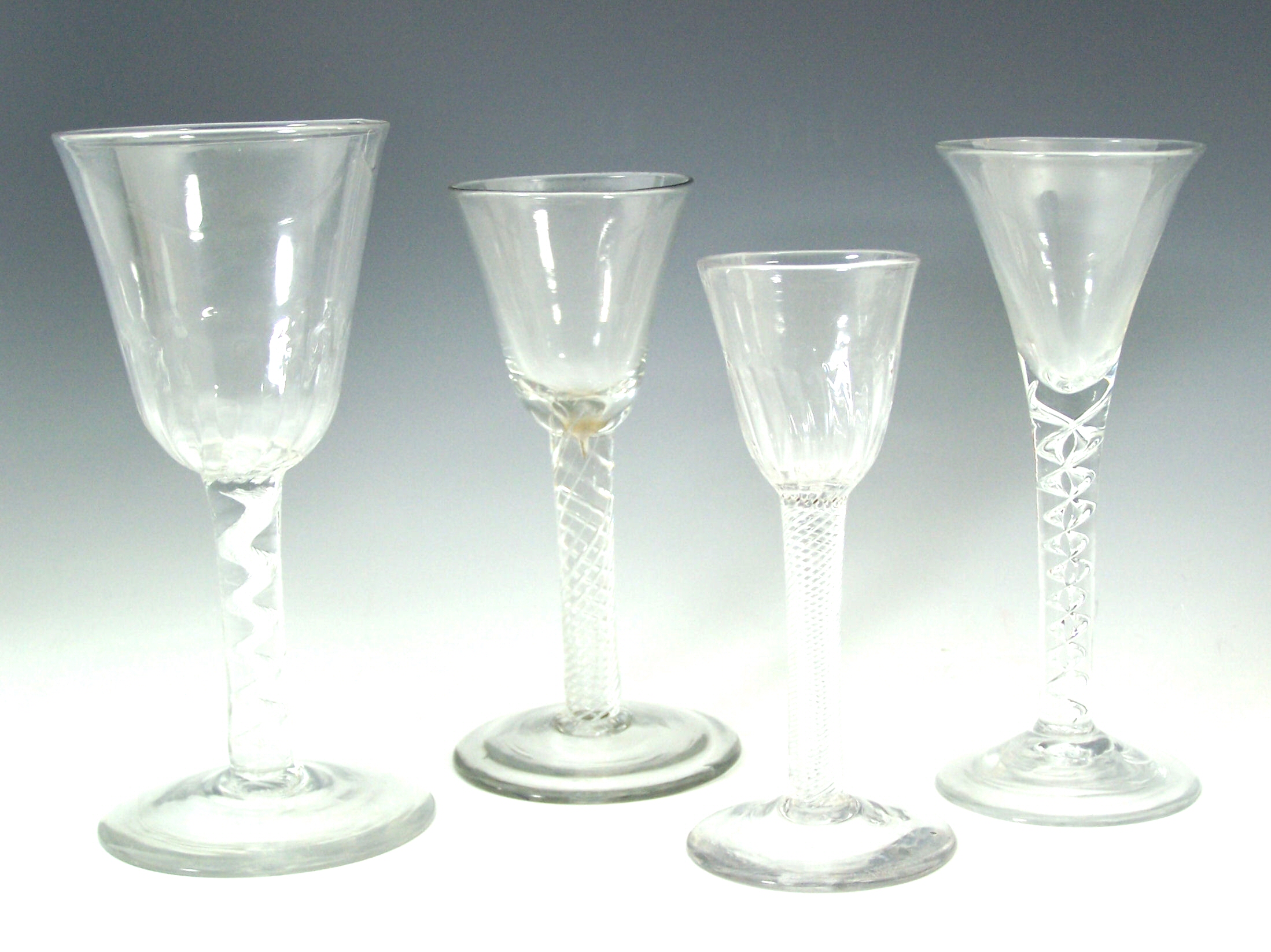 the large bell shaped part wrythen moulded bowl, over single multi-strand airtwist stem with domed foot, 17.3cm high; another smaller, with similar bowl and multi airtwist stem, 14cm; and two others, plainer (4)