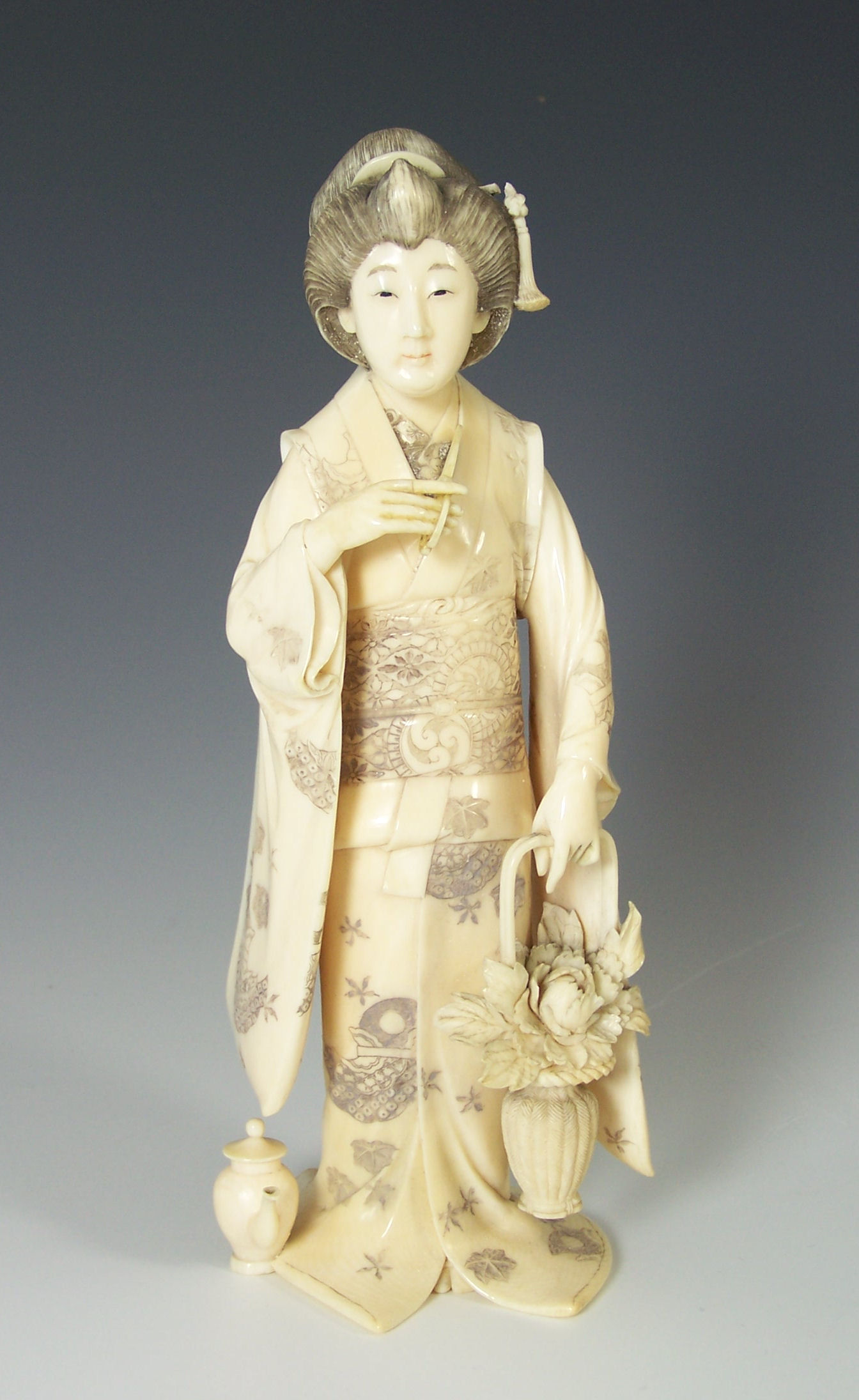 standing, and holding a basket of flowers in one hand and a pair of scissors in the other, signed