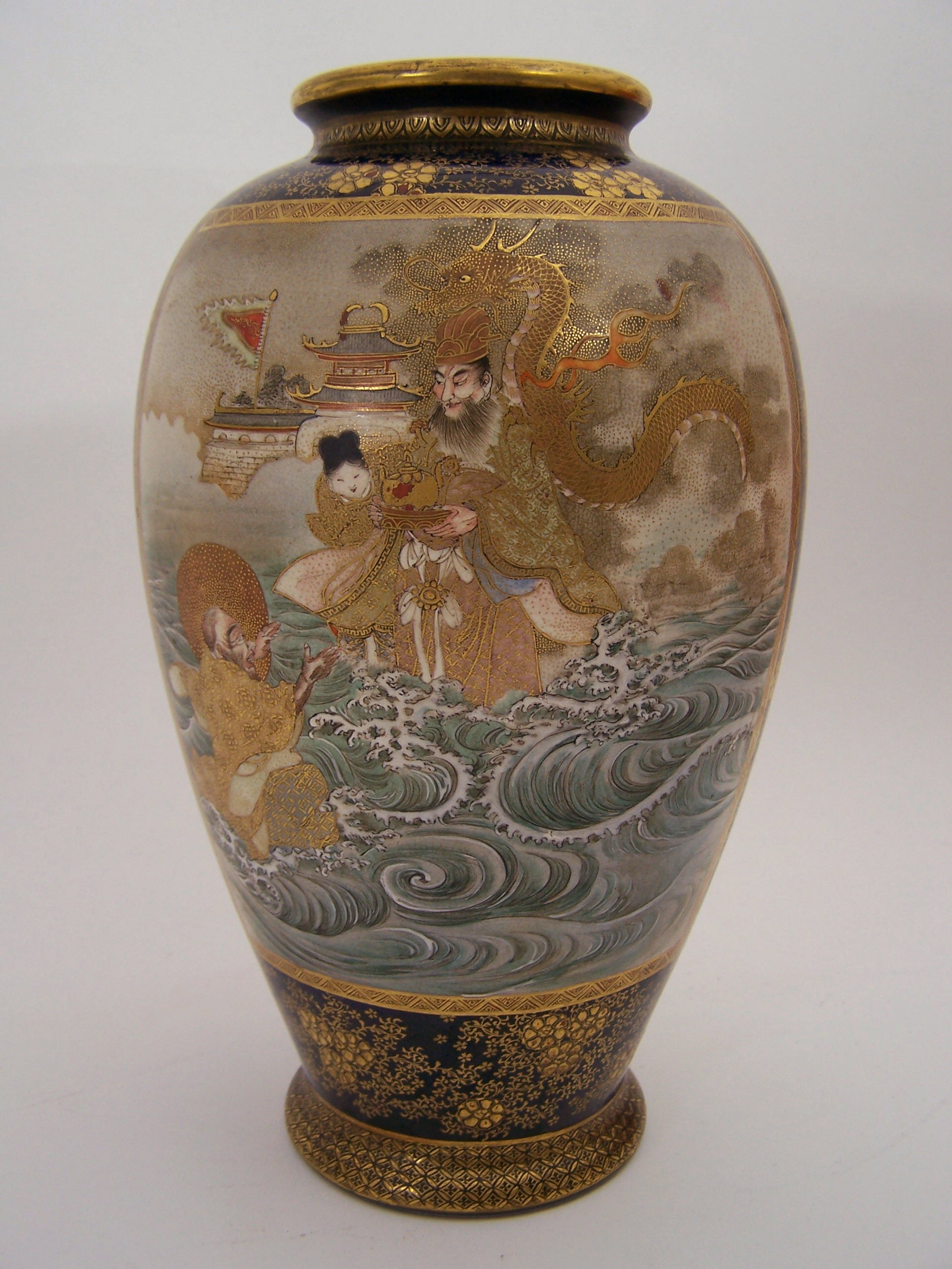 decorated with stylised flowerheads and scrolling foliage in gilt on a dark blue ground, with opposed rectangular panels, one depicting women and children in a landscape, the other with a mythical seascape with Immortals and a dragon, signed
