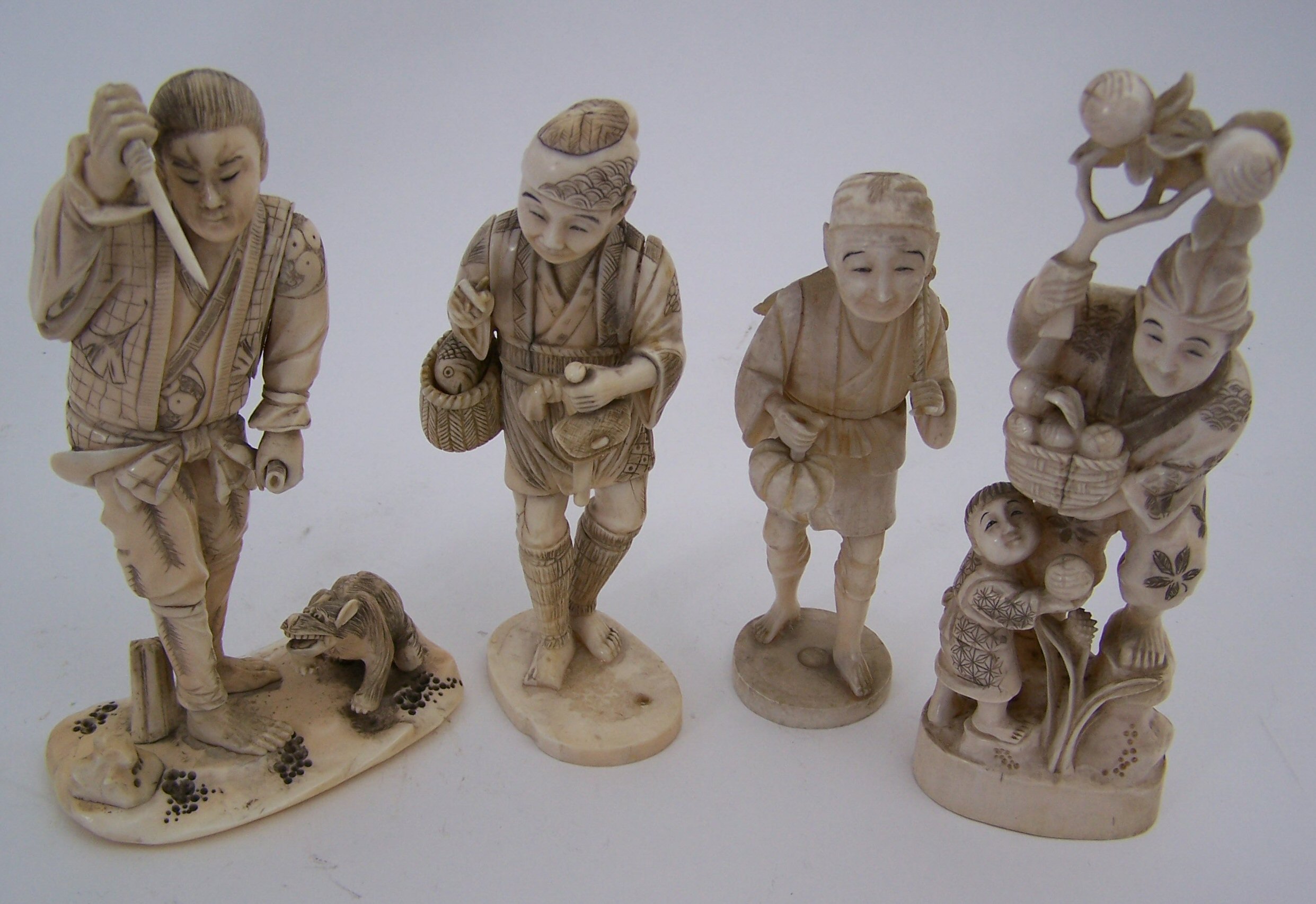 comprising: a standing male figure holding a basket of fruit in one hand and a twig in the other with a child by his feet, 19cm high; a male figure holding a dagger over a wolf like creature, signed, 18.5cm high; a figure of a fisherman with a fish in a basket, signed, 17cm high; and another of a man with a basket on his back and bag in his hand, unsigned, 15.5cm high (4)