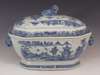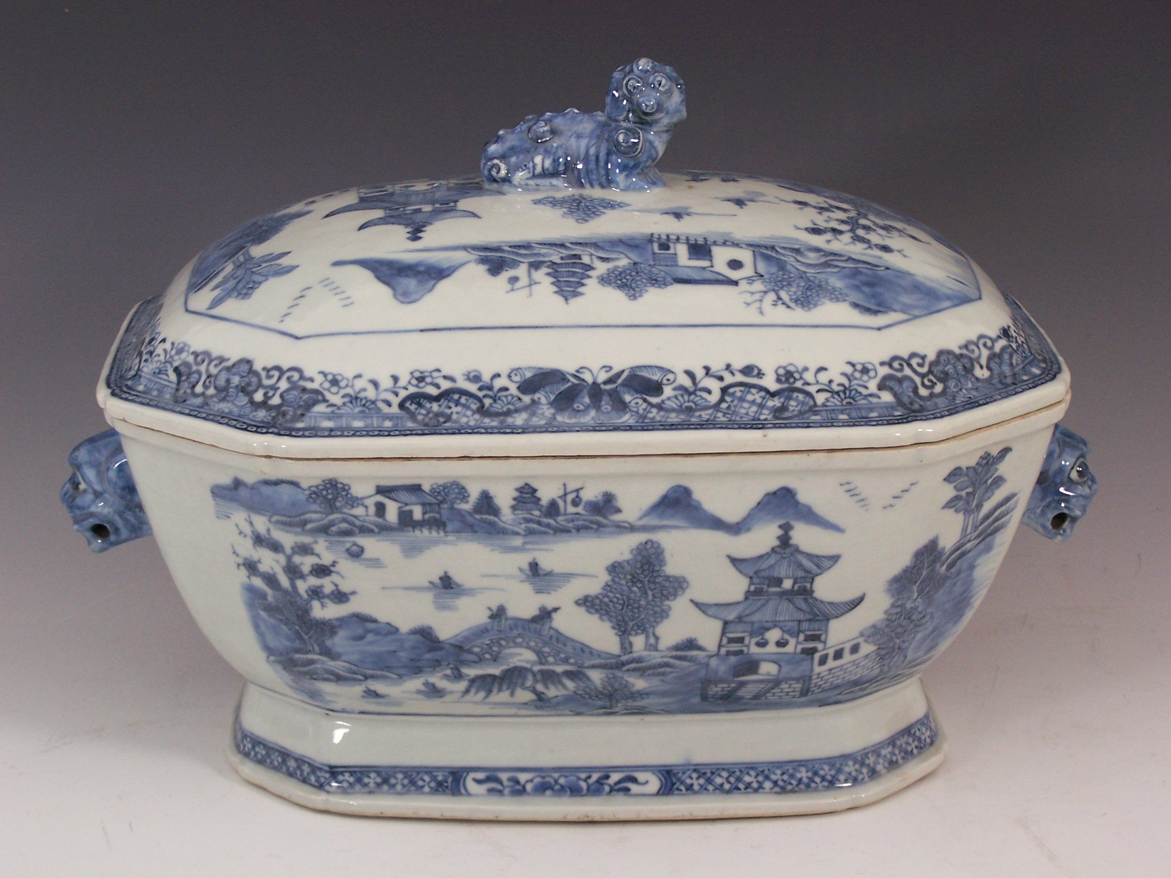 of canted rectangular form with applied foot, the cover with crouching dog of Fo finial, painted with a pavilion and riverscape panel, the border decorated with butterflies, the body with opposed Dog of Fo head handles, similarly decorated (2)