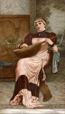 painted with a seated lady holding a mandolin, in a Victorian interior, signed and dated 1887, in a decorative gilt frame