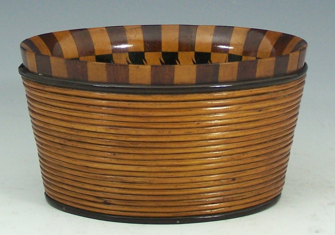 of oval tapering form, the interior of chequer inlaid construction, the exterior with rush banding