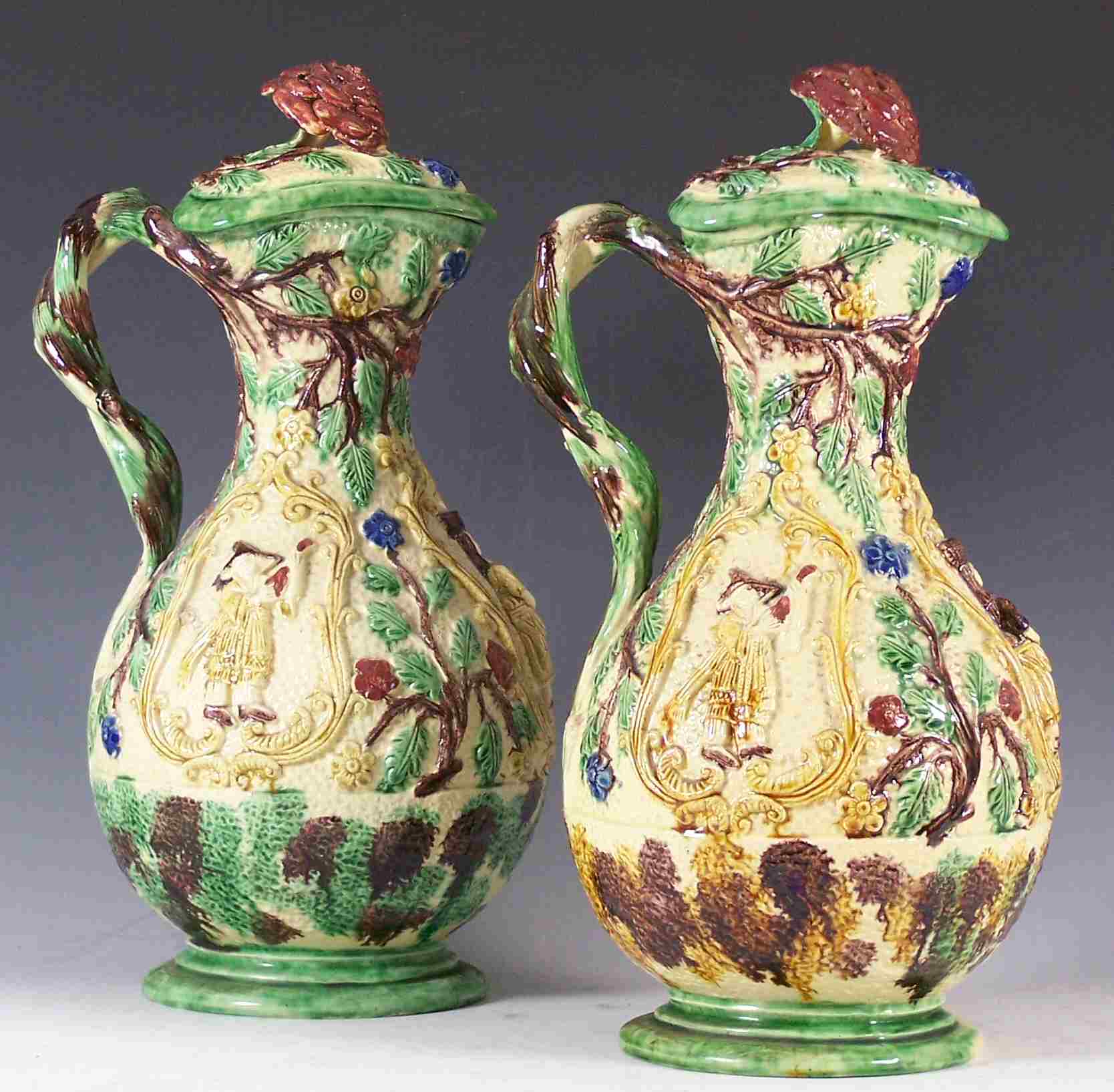 A pair of 19th century moulded and decorated tin glazed jugs and covers