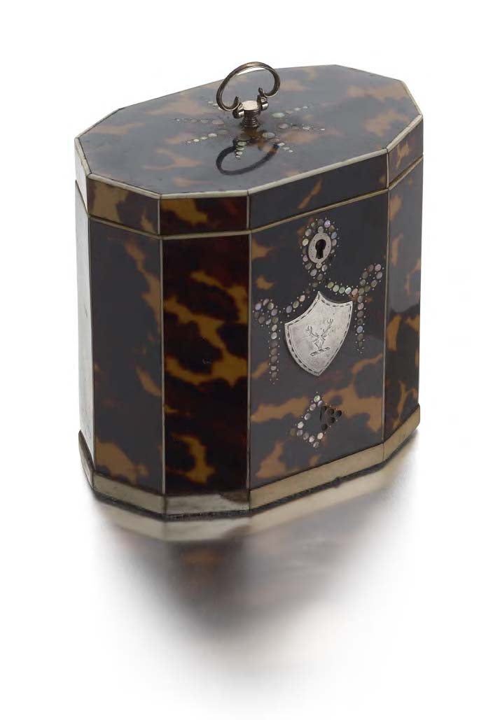 A George III tortoiseshell and ivory-inlaid tea caddy
