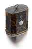 of ten-sided section, the hinged lid with silver handle, inlaid with radiating mother of pearl dot motifs and enclosing a lidded compartment for tea, the sides with applied shield-shaped cartouche and escutcheon, and corresponding dot inlaid decoration