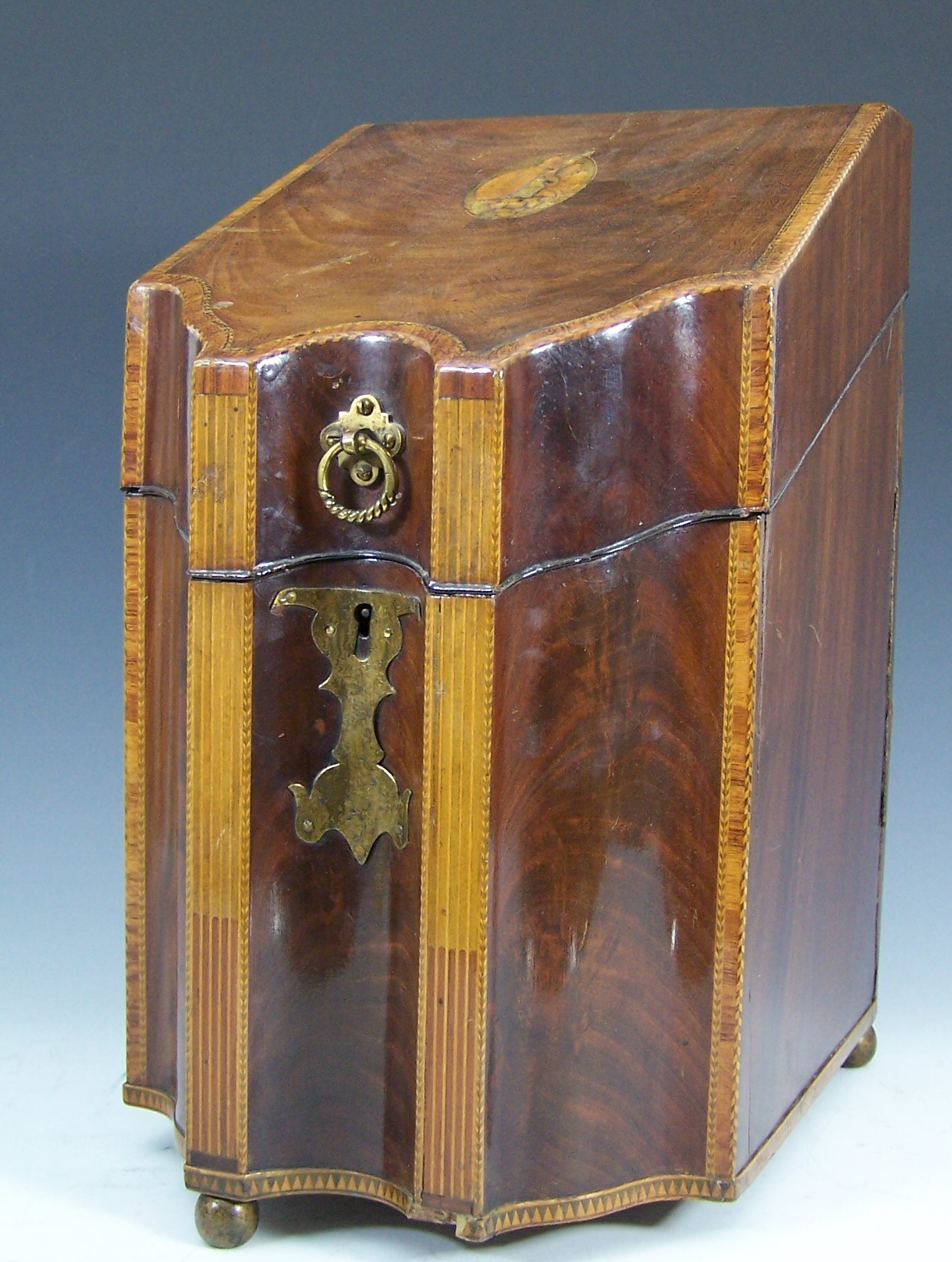 with chevron banding, the hinged sloping lid enclosing later fitted interior above an arc en arbelette front with inlaid pilasters raised above sphere feet