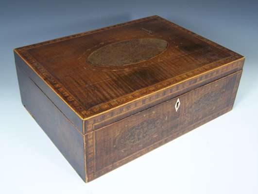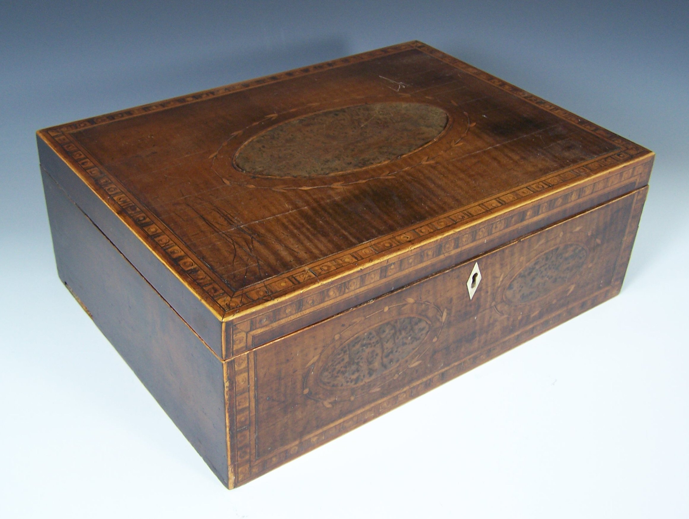 inlaid with stringing and banding, the hinged lid with a central burr yew oval panel enclosing a now void interior, the front with conforming ovals