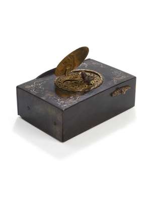 of rectangular form, the top inlaid with mother of pearl, steel and brass flowers and set with cast brass oval lid enclosing a fretwork panel and singing bird automaton, the back with hinged lid containing a void for snuff