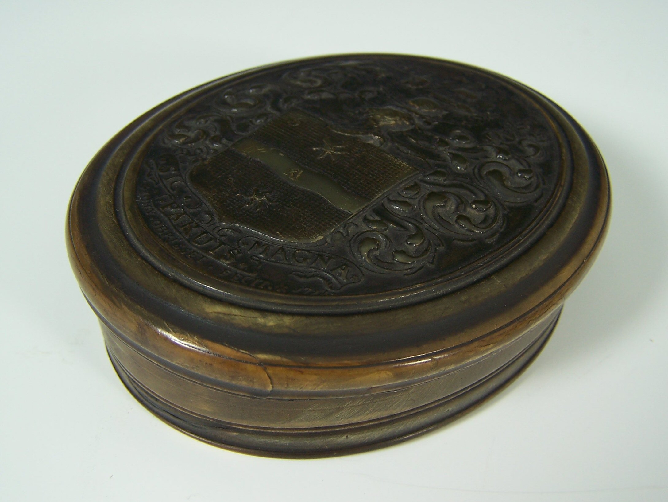 of oval form, the lid carved with a coat of arms and inscribed 'Sir Frances Drake/Sic Paruts Magna/John Obrisset Fecit 1712'