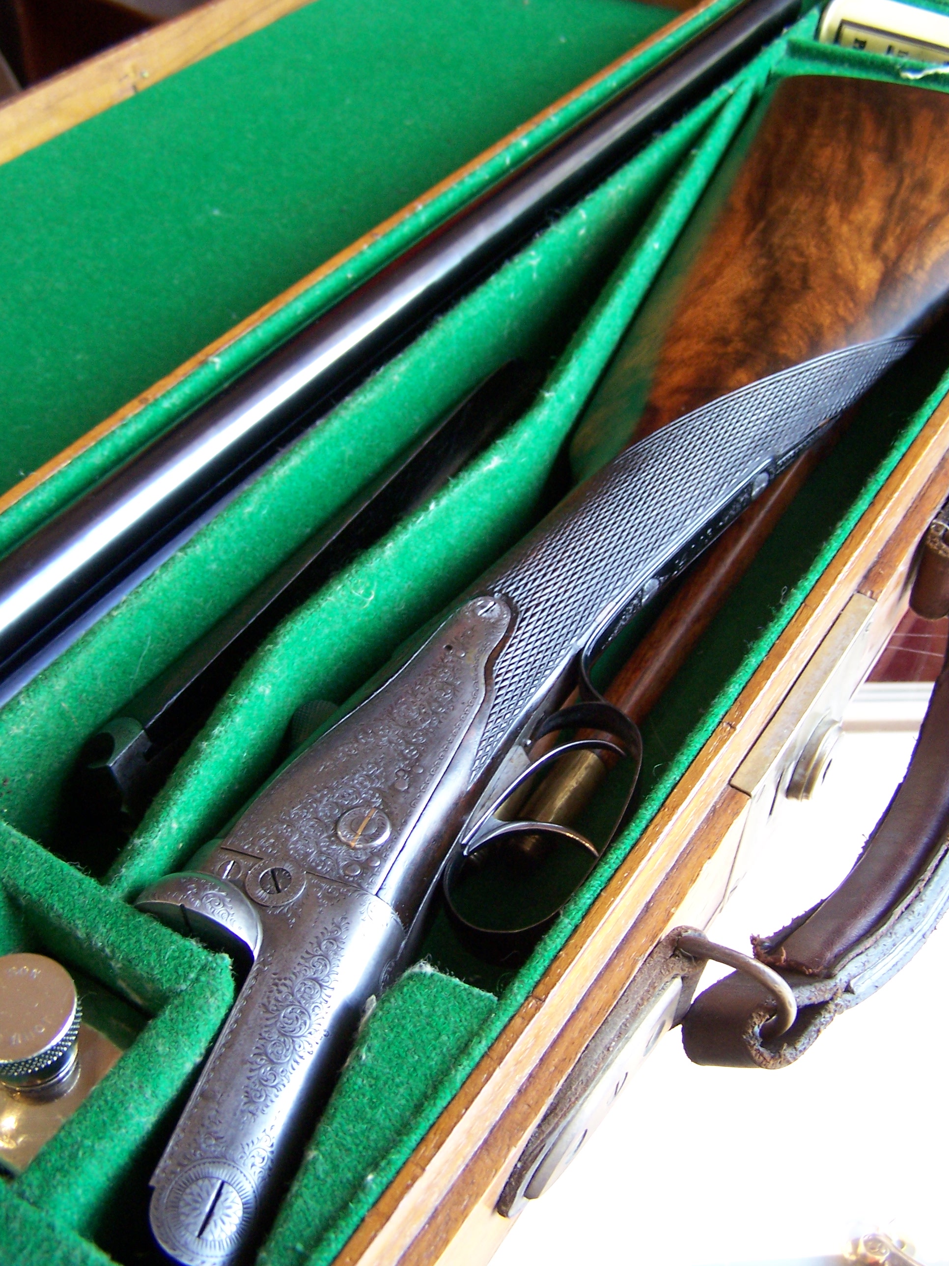 number two of a pair, with fine scroll-engraved action, gold-lined cocking indicators, re-blued 28inch nitro-proofed barrels with well-figured walnut stock, chequered grip, silver escutcheon engraved with a family crest of a falcon, contained in a brass-bound hardwood case lined in green baize with accessories, serial number 14003.