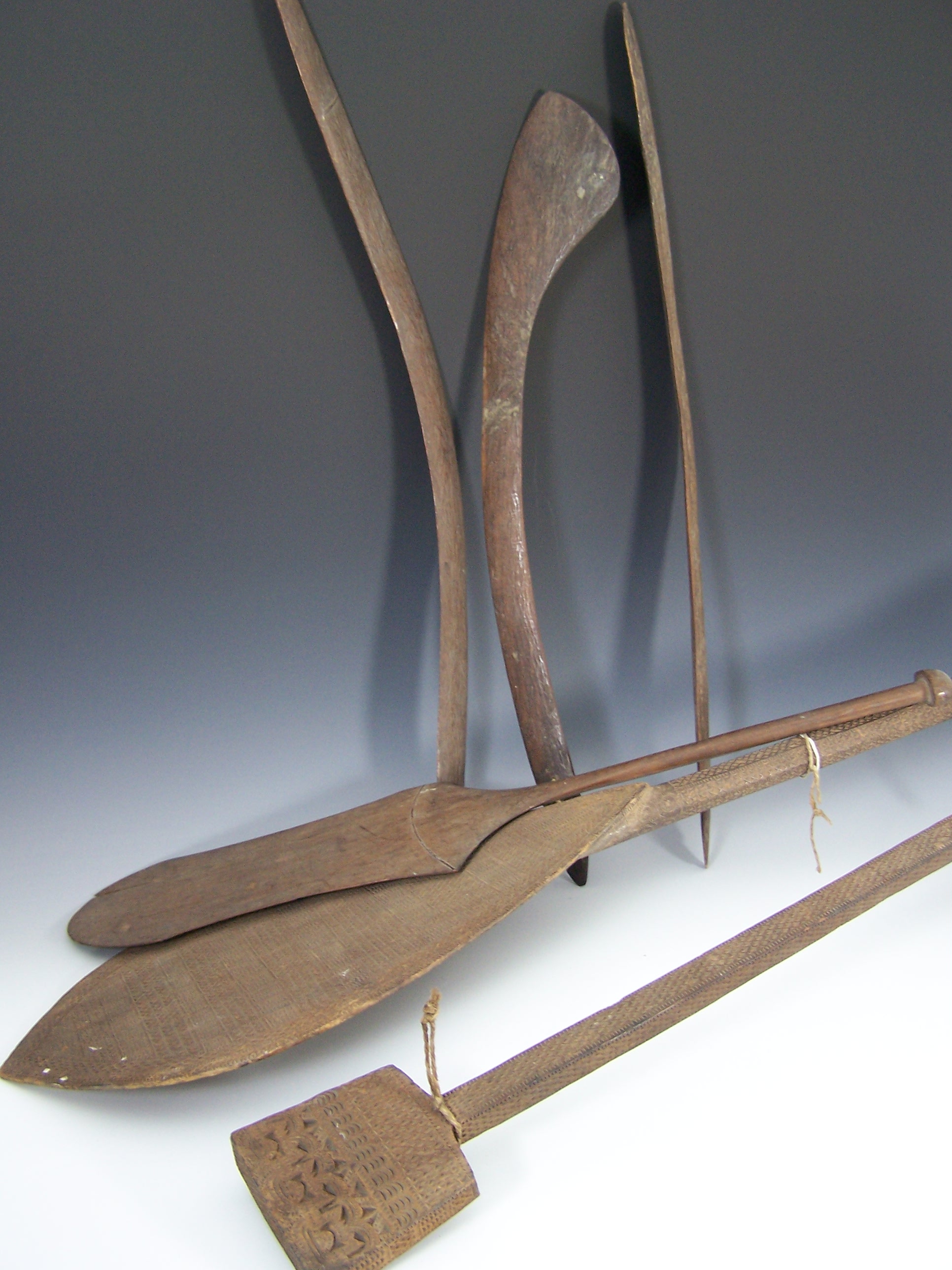 with allover carved decoration, 132cm long; a small paddle; and three hardwood boomerangs (6)