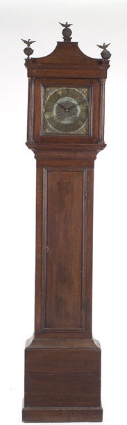 the twin train movement with anchor escapement, the square brass dial with Roman chapters, the hood with caddy top above fluted finials